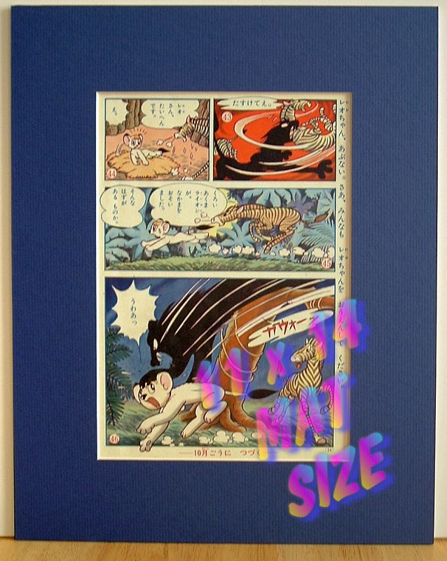 DescriptionThis is an original page from a serialization of the Japanese Kimba manga, a reprint from the 1960s. In this installment, Kimba is attacked by someone impersonating a black lion. (The complete story is available in a modern reprint book, here.)This page is clean and bright, with no visible defects. ![]() This original page measures approximately 9.5 inches by 6.5 inches and has been mounted and matted to an outside dimension of 11 by 14 inches, ready to insert into any standard-size 11x14 frame. Only archival quality materials were used in mounting and matting this rare item. It will be shipped flat. |