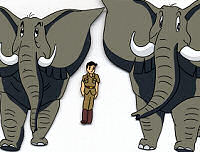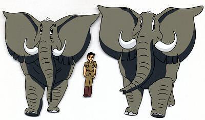 This is an original hand-painted production cel from Jungle Emperor/Kimba the White Lion, from Mushi Productions in 1965. It was used in episode 44, "A Friend In Deed". The scene is when the elephants are releasing Roger Ranger after holding him captive.