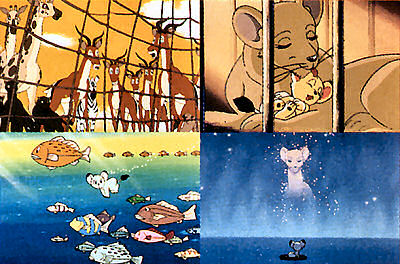The movie tells the story --entirely with music and animation, no words-- of the first Kimba episode, showing Panja's peaceful jungle, the coming of the hunters, the capture of Eliza and the death of Panja, and Kimba's birth and escape back to Africa. 51 minutes.