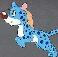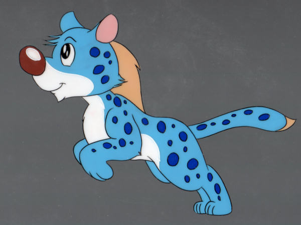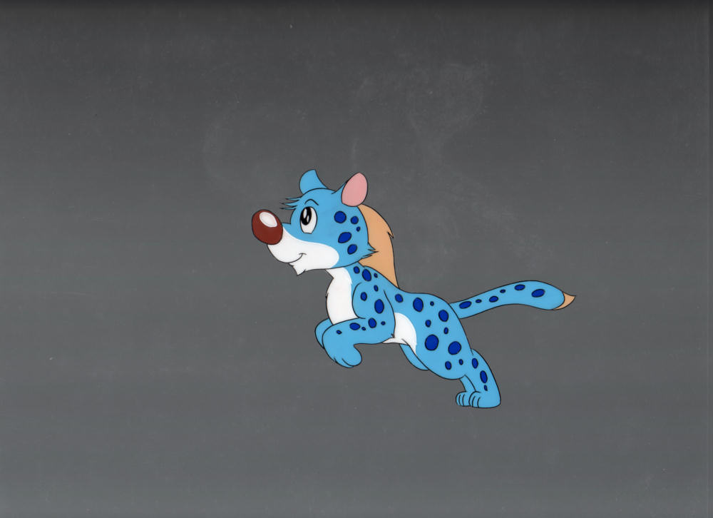 This is an original hand-painted production cel of Kimba the White Lion, from Mushi Productions in 1965. One of a kind--not a limited edition sericel. This cel shows Dash the baby cheetah jumping.