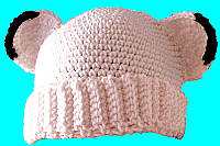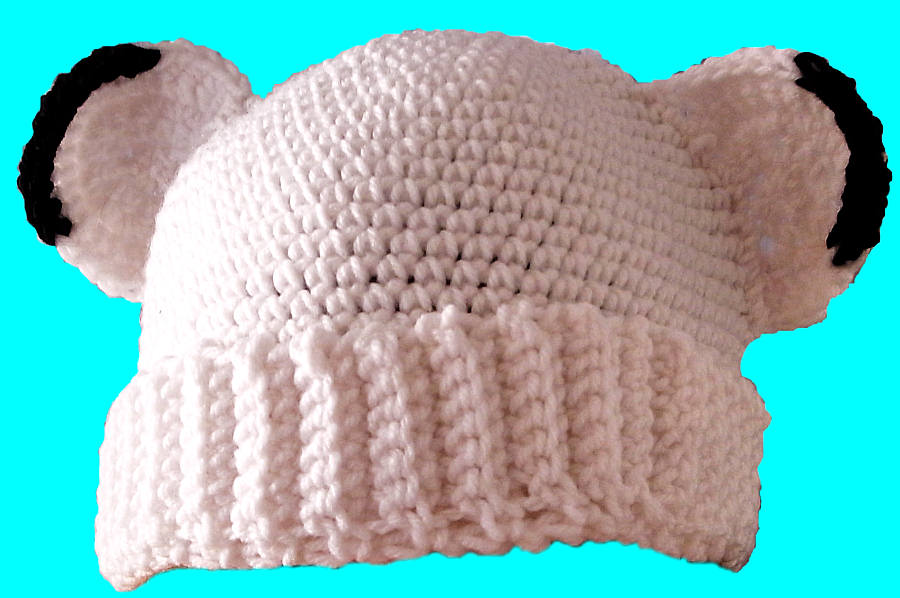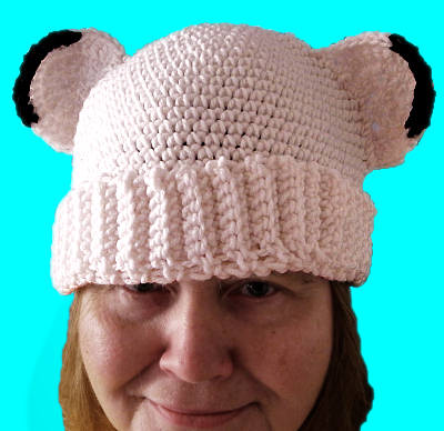 Here is a crocheted hat with fold-up brim and ears that have black tips!