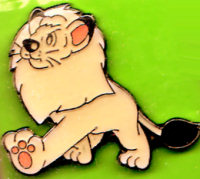 Leo/Kimba measures approximately 1 inch high and 1.25 inches long. The pin has yellowed slightly with age.