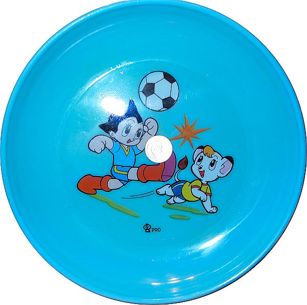 DescriptionThis is a set of original Japanese plastic plates, approximately 40 years old or older. One each of yellow, blue, and pink; each features Kimba the White Lion with other characters from the mind of Osamu Tezuka: Princess Knight and Tink, or Astro Boy.Each plate in this set is 7 inches in diameter and 1 inch deep. Each is made from sturdy plastic and each has its original Mushi Productions seal of authenticity. (Mushi Productions went out of business in 1973, which is an indicator of when these plates were made.) These plates are new old stock, never used. Click each picture above for a larger view. |