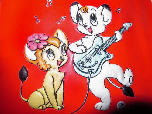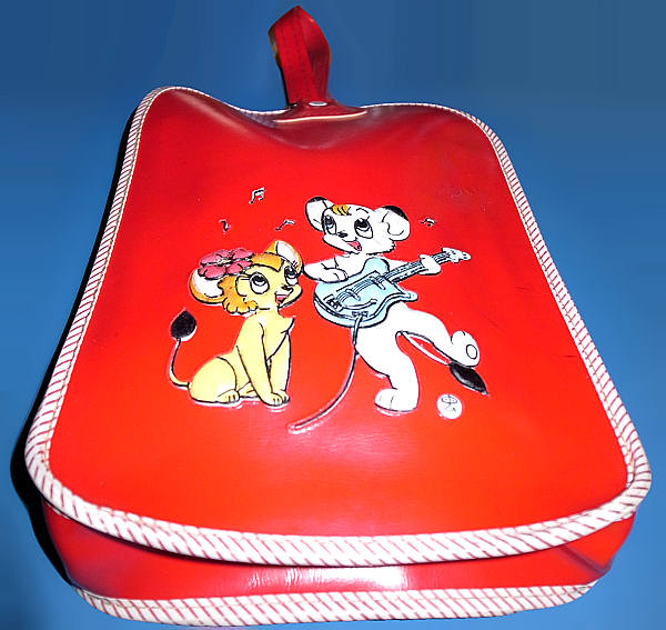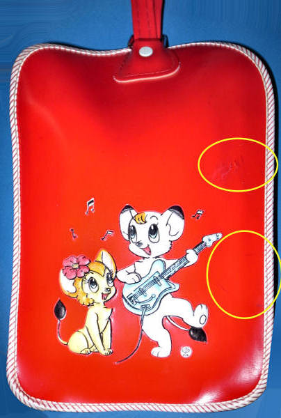 DescriptionThis is an original vintage Japanese Jungle Emperor / Kimba The White Lion case with carrying strap. It features a large (4 inches high) raised relief picture of Kimba serenading Kitty, who has a flower in her hair. The styles of the characters suggest that this was made circa 1965 or 1966.![]() ![]() ![]() ![]() The front and back measure approximately 10 inches high and 7 inches wide. The sides can expand to yield a thickness of 1.25 inches. The carrying strap fits through a metal loop to secure the contents of the case. On the back is a small cutout pocket, approximately 1.5 inches by 1 inch, that can hold a photo. This item is in excellent condition for its age. It has NO tears or loose stitches. There are a few light pen marks on the front, as you can see in the picture below. There is a very light amount of dirt on front and back. ![]() |